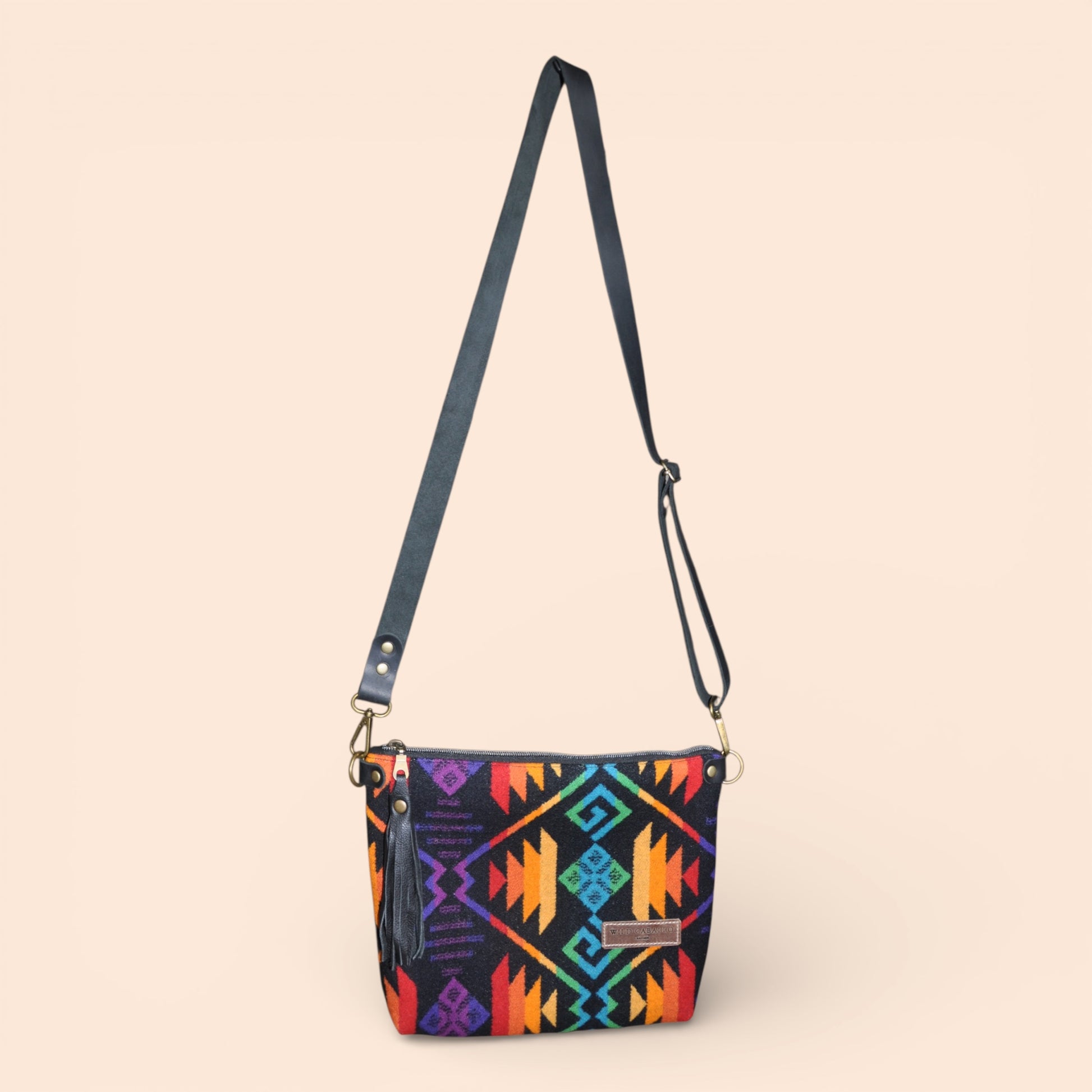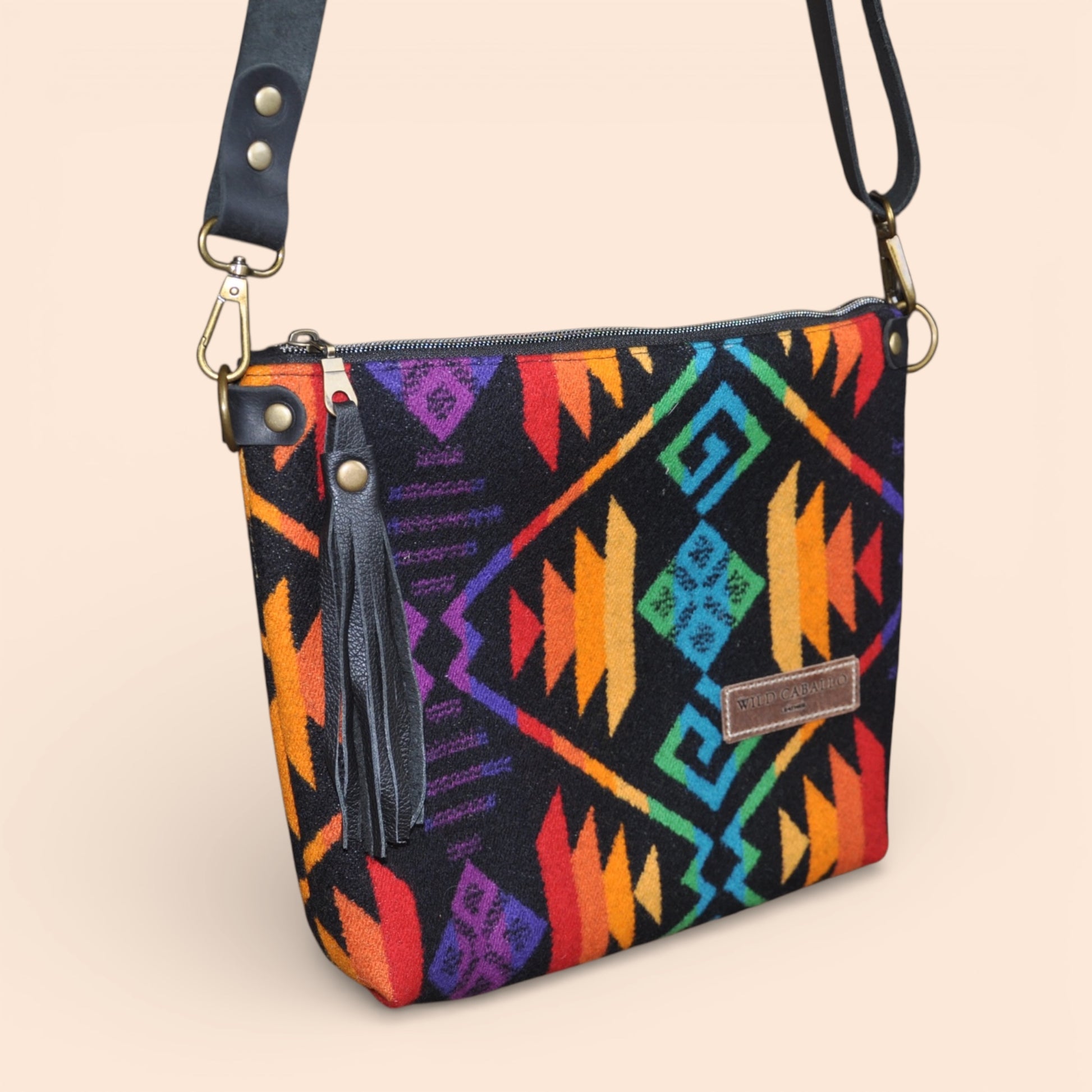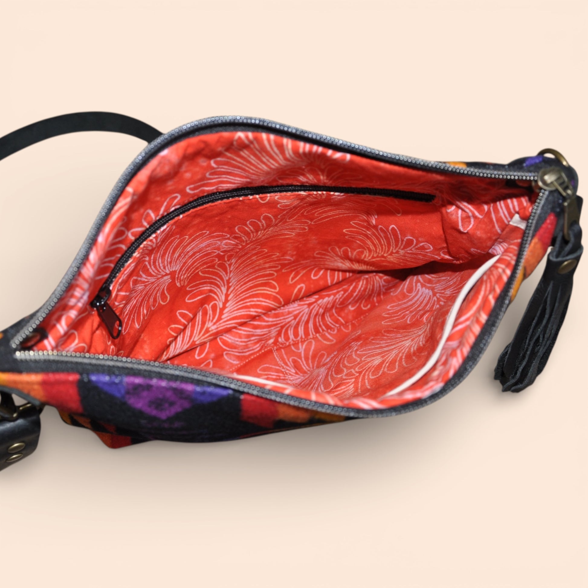 Super fun little purse! Tons of pockets. Adjustable brown leather shoulder strap. Handmade with authentic Pendleton®️ fabric, Coyote Butte pattern. Lined with cotton.