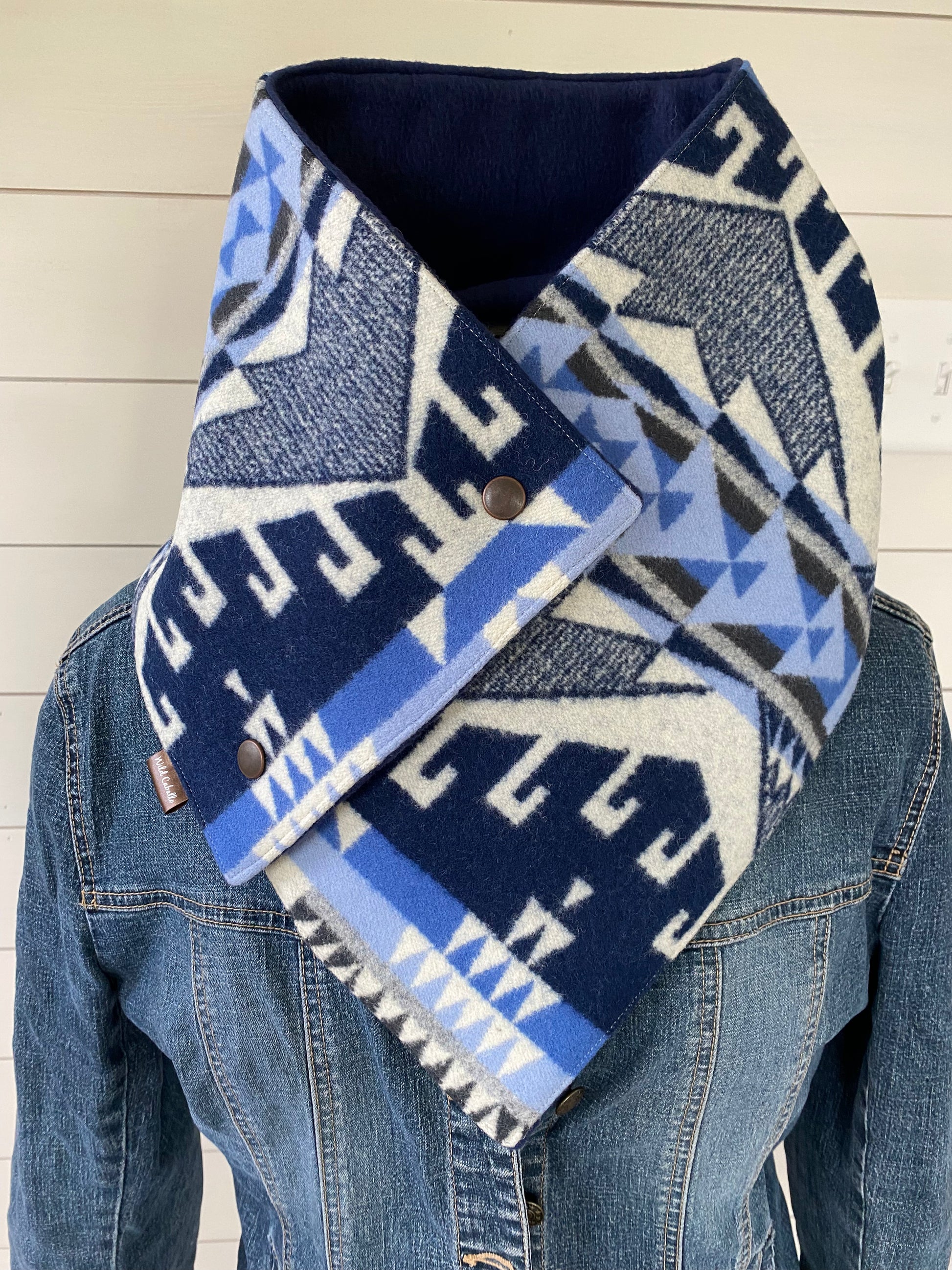 Handmade with authentic Pendleton®️ fabric. Snap closure, lined with navy blue fleece.